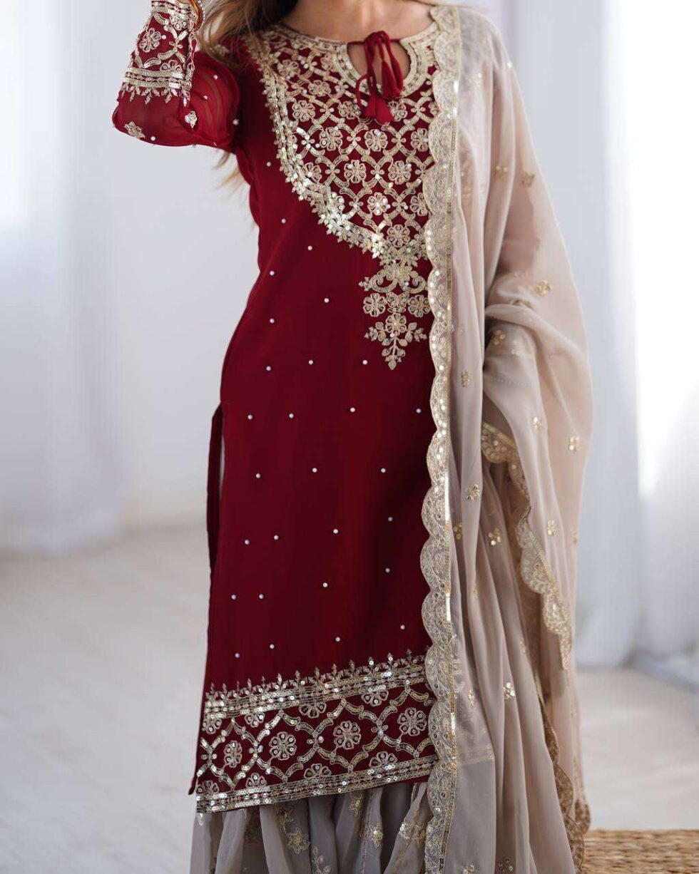 Women’s Faux Georgette Sequins Embroidered Straight Kurta With Sharara Suit and Dupatta Set